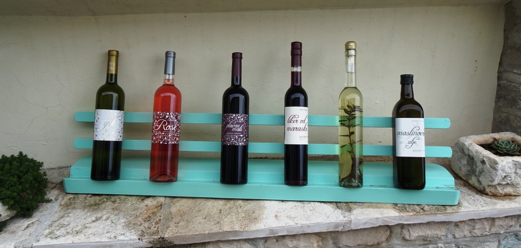 From left to right-white wine, rose, red wine, sour cherry liquor, ragi w/herbs (grappa), olive oil.