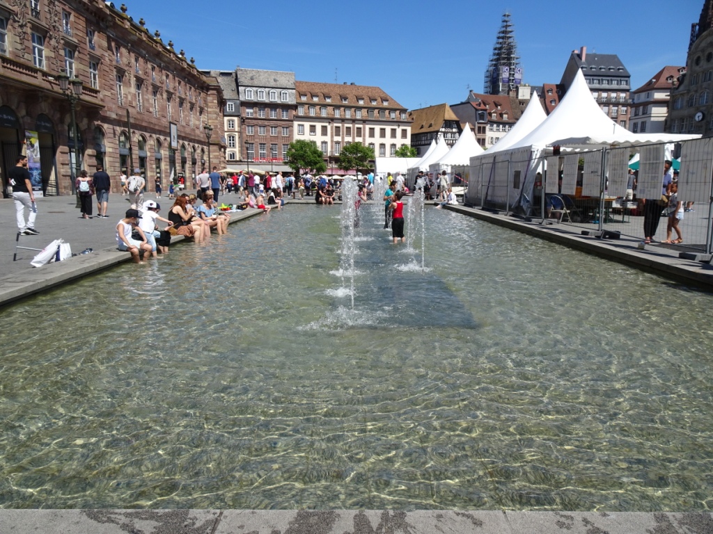 Some of the hottest weather of our trip was here in Strasbourg, and many people found the fountains a nice place to cool off.