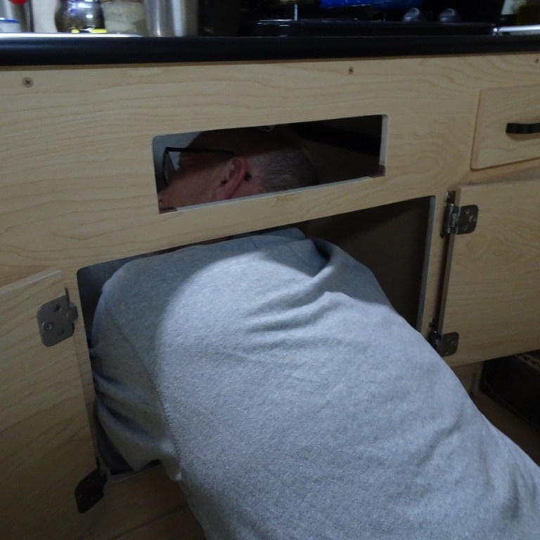 While doing the dishes the faucet handle broke off. Hum, no way to turn on the water. Fortunately, Gary’s plumbing skills pay off. We had to remove everything from the cabinet. Tight quarters. He pulled it all apart and fixed it.